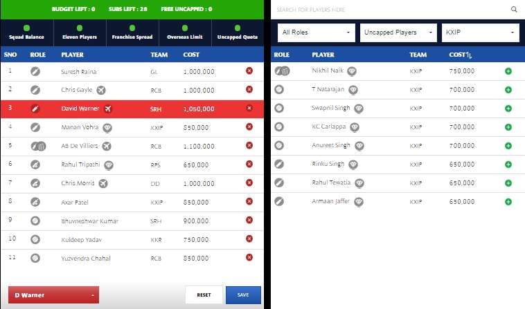 Shaun Marsh at No.3 has made sure that the highest Glenn Maxwell can come in is at No.4, which is a fantasy downer against a quality bowling side like Sunrisers. It also results in Hashim Amla becoming the team’s best bet, but for me, it is a direct shootout between him and Warner. I side with the latter because he faces a much easier bowling attack and hence becomes a captaincy material.