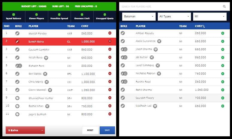 Kohli and De Villiers are no-brainers. Between Smith and Stokes, the only reason Stokes is in my team is because I have managed to carry him around; if you are looking at just this match, Smith is a more assured pick. I have switched the banker role from Rahane to Manish Pandey, and with RPSG only playing their next after six matches, it doesn’t make much sense going back to him at the moment.