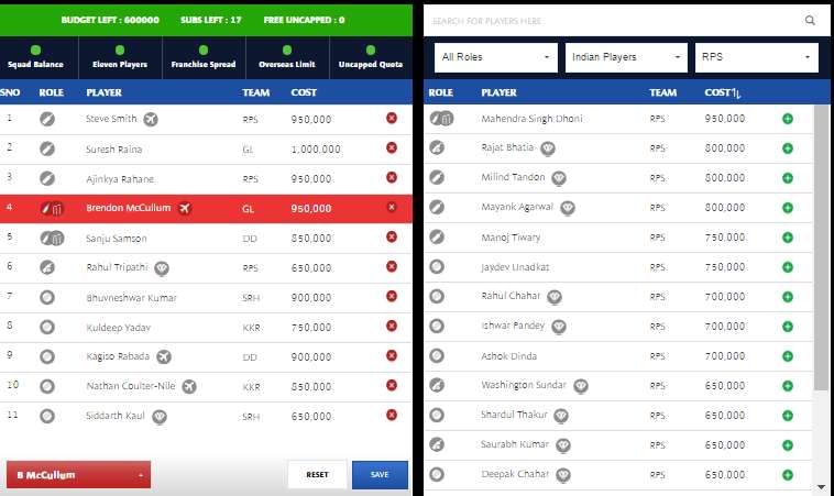 From Gujarat Lions, I already have Brendon McCullum. With Andrew Tye ruled out and Aaron Finch batting at No.4, Suresh Raina is the only other capped player left who is capable of big returns. With the bowling attack he is facing today, it might turn out to be a grave mistake to go in without the left-hander