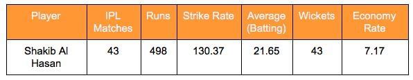 Shakib Al Hasan (Kolkata Knight Riders) - An adept batsman and astute bowler, Shakib has bailed out KKR many times with either bat or bowl. With the bat, he is strong against the spinners and with the ball, accuracy is his strength.