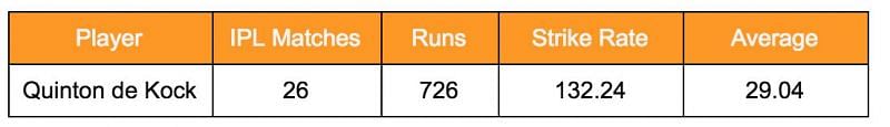 Quinton de Kock (Delhi Daredevils) - Quinton de Kock is a typical left-handed opening batsman who loves cutting the ball and plays an aggressive brand of cricket. He loves pace on the ball and can get the team off to a flier. As a keeper too, he has been magnificent.