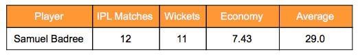 Samuel Badree (Royal Challengers Bangalore) - The Trinidad leg-spinner came into limelight after he bamboozled the MI batsmen to pick a hat trick. His strength is bowling skidders and wrong-uns with unerring accuracy.