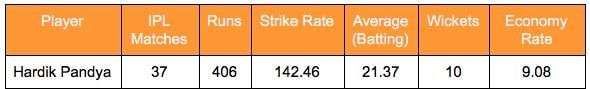 Hardik Pandya (Mumbai Indians) - The flamboyant MI all-rounder, Pandya wrecks the opposition bowling with his power hitting. As a bowler, he hits the deck hard and bowls a good short ball. Pandya also bowls a very well-disguised slower bouncer.