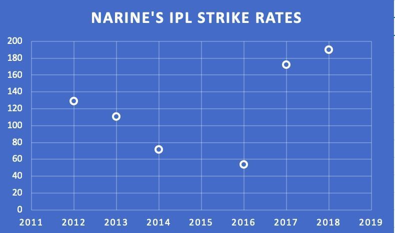 The Knight Riders rejuvenated Narine's batting exploits in 2018 by allowing him to open the innings. And boy did he respond. 357 runs at a strike rate of 189.89.