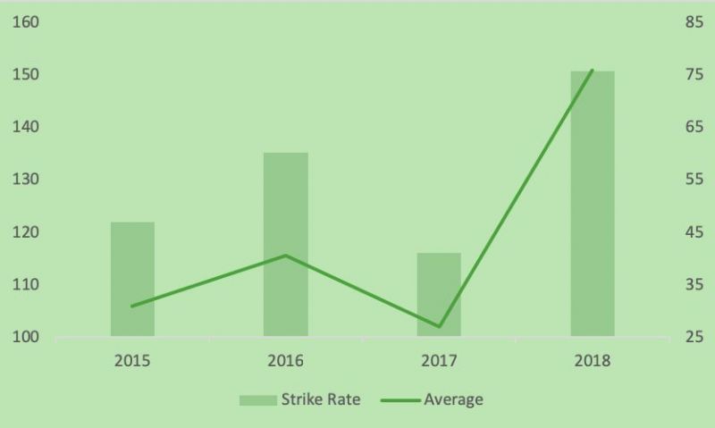 The IPL 2018 was a superb tournament for Rahul, who hit 659 runs at a stellar average of 54.91 (strike rate of 158.41), playing for an otherwise lacklustre side in Kings XI Punjab. Even Chris Gayle's one-off acts were mere spectators to Rahul's explosive consistency.