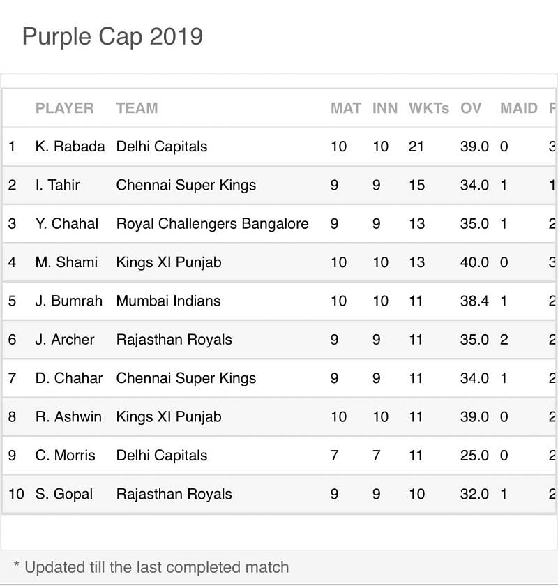 Kagiso Rabada added two more wickets to his tally and has 21 wickets from 10 innings to hold the Purple Cap. Mohammad Shami cleaned up Colin Ingram in the second match and took his tally to 13 from 10 innings. He is followed by Jasprit Bumrah who has 11 wickets. Jofra Archer is at six with 11 wickets from nine innings. The spinners Ravichandran Ashwin and Shreyas Gopal are at eight and ten in the table, with 11 and 10 wickets each. Meanwhile, young leggie Rahul Chahar is climbing up the ranks with two three-wicket hauls and is currently 11th with 9 wickets.