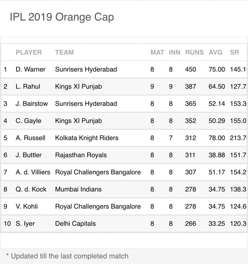 It has been a fairytale comeback story for David Warner. He has already smashed 5 half centuries and a century in 8 innings so far in the tournament. He is the proud owner of the Orange Cap with 450 runs in 8 innings. Today's innings of 61* from Bairstow, saw him climb upto the 3rd position in the race for the Orange Cap with a total of 365 runs in 8 innings with 1 half century and 1 century to his name.