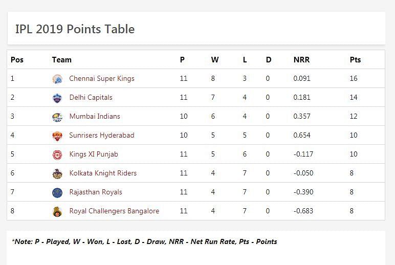 RR now has four wins from their 11 games and is at 8 points. The Points Table is becoming increasingly interesting now that the teams at the bottom half of the table has started defeating the teams at the top half.