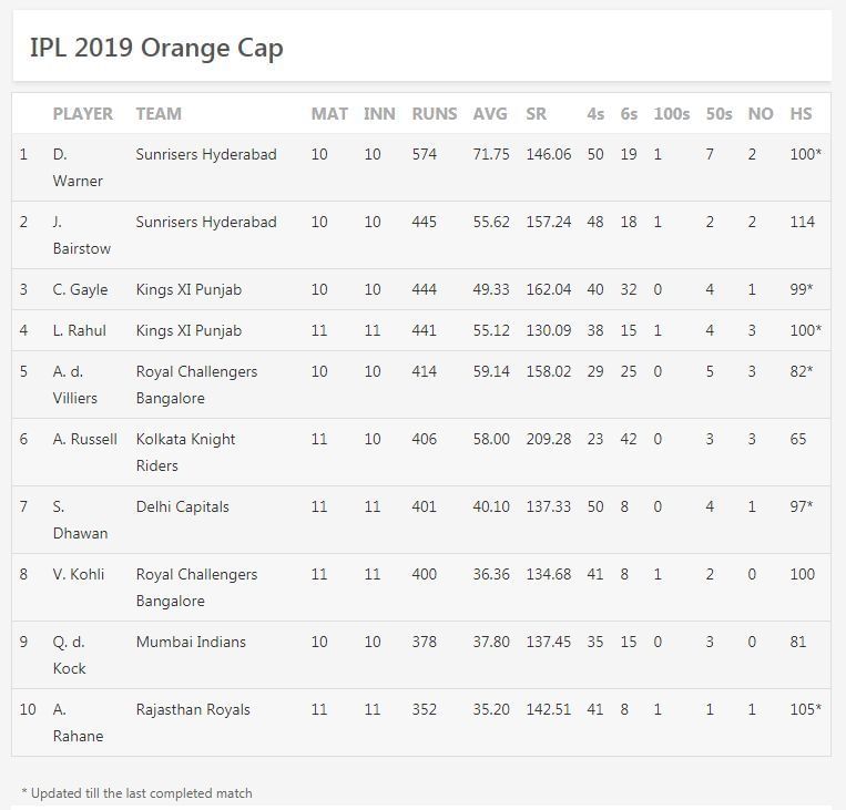 The Orange Cap has not changed hands as yet and is still with Warner. Rahane though seemed to have picked up form in the last few innings and has entered the top 10 with a century and a half century to his name. Russell is at the 6th position with 406 runs and 3 half centuries.