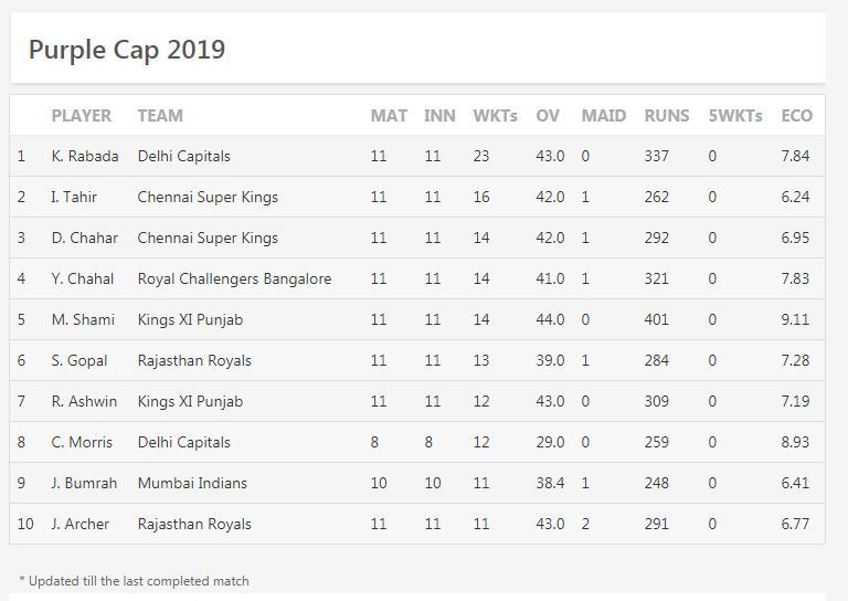 Kagiso Rabada is way ahead of the rest of the bowlers in the race for Purple Cap with 23 wickets in 11 matches. Shreyas Gopal has had a good season so far and is at the 6th spot with 13 wickets from 11 matches. His teammate Jofra Archer is at the 10th position with 11 wickets from 11 matches. One of the biggest reasons for KKR's failure could be owing to the fact that they are the only team which has no bowlers in the top 15 of the most wickets list.