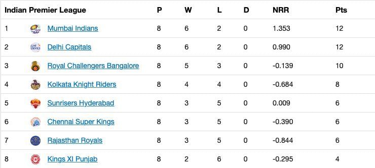 With this dominating win over KKR, the Mumbai Indians secure their fifth consecutive win and reclaim top spot in the points table, displacing the Delhi Capitals in the process. The Kolkata Knight Riders retain the fourth position with four wins from eight matches, but their Net Run Rate takes a hit with that defeat.