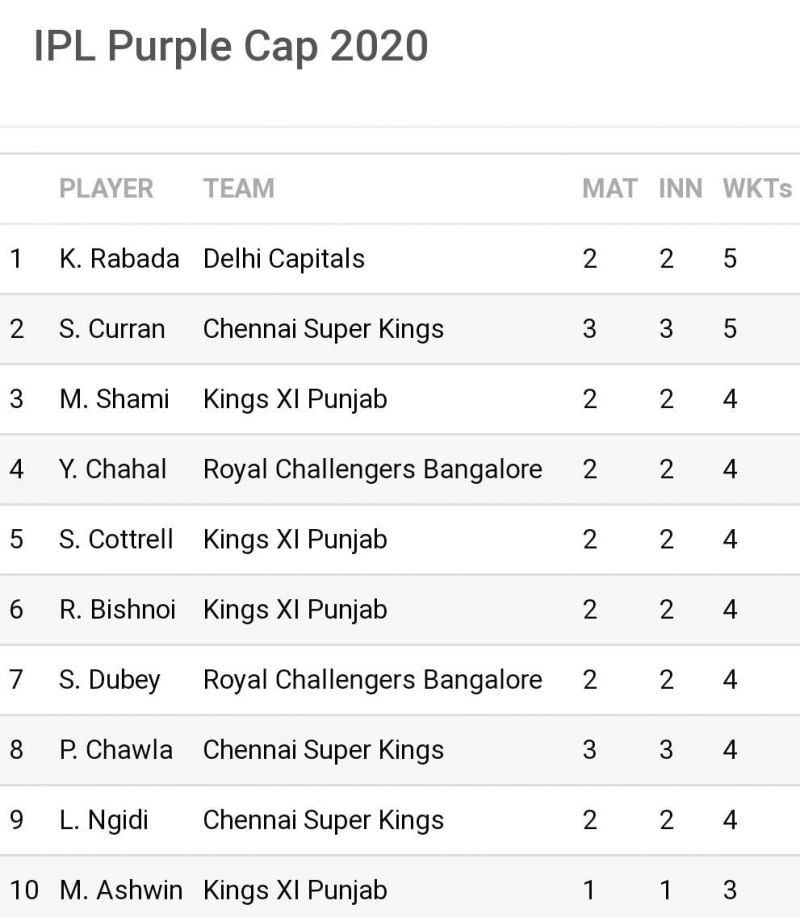 Kings XI Punjab (KXIP) duo of Mohammad Shami and Sheldon Cottrell, and Yuzvendra Chahal – all three on four wickets apiece – complete the top 5 in the race for the IPL 2020 ‘Purple Cap’.