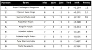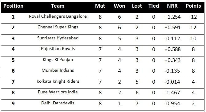 Below is the updated IPL 6 points table. Royal Challengers Bangalore are sitting pretty at the top with Chennai Super Kings following them at 2nd position. Both the top teams have same number of points, but RCB’s superior net run rate has kept them ahead of CSK. Defending champions KKR are languishing in the 7th spot with only two wins this season.