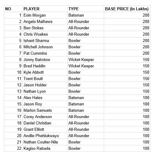 Ishant Sharma, who was one of seven players to have listed themselves at the highest base price of INR 2 crore, is the only Indian international who has a base price of more than INR 50 lakh. England stars Ben Stokes, Eoin Morgan, Chris Woakes, Australian fast bowlers Mitchell Johnson, Pat Cummins and Sri Lankan captain Angelo Mathews are the others who have listed themselves at INR 2 crore.