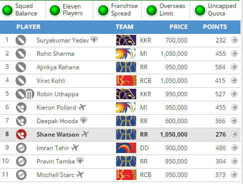 Shane Watson would be my captaincy pick for the match. Deepak Hooda would obviously be my first choice uncapped player, with Pravin Tambe being the second best.