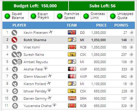 Yuzvendra Chahal makes the cut as the uncapped player. Akshar Patel has been impressive, but he is most likely to bowl to two class batsmen in Kohli and AB de Villiers and two left-handers in Parthiv Patel and Yuvraj Singh. Although I don’t expect much from him, he is already in my team which gives me no choice but to stick with him.