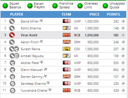 With Glenn Maxwell and Virat Kohli already in my team, the only other player of any interest in this match is David Miller. Chahal stands in the way of him succeeding, though.