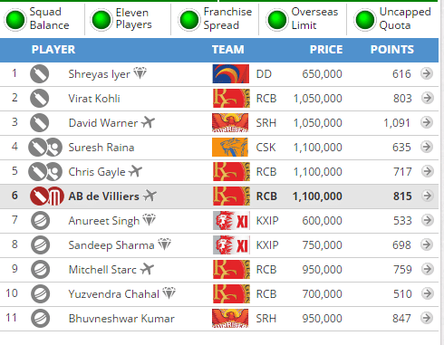 Captaincy choice – AB de Villiers (If RCB bat first)/Mitchell Starc (if RCB bowl first)