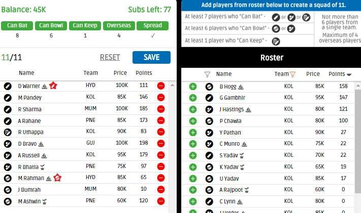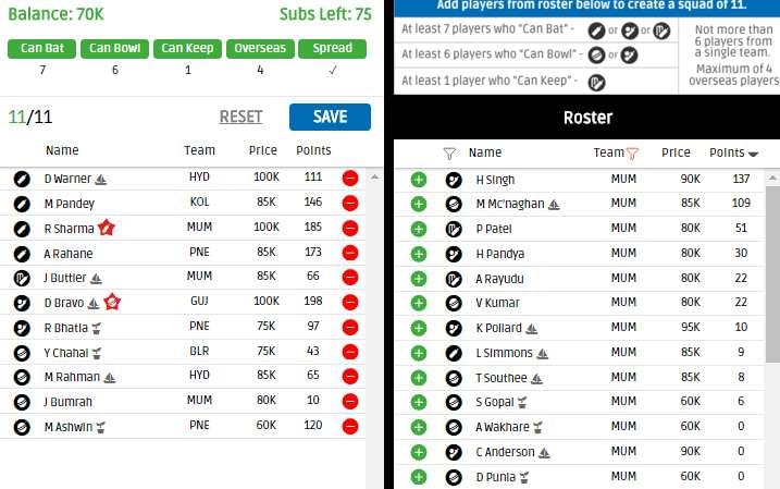Aaron Finch – I had to choose between Warner and Finch. Warner gave me a much better captaincy option as compared to Finch, who I will anyway not be captaining. Also in McClenaghan, Bumrah and Suchith, Mumbai have the arsenal to get Finch out.