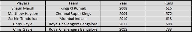 IPL 6 is almost upon us. So we decided to dig up some statistics and so here is the list of Orange cap winners i.e. the highest number of run scorers in a season! The mercurial Jamaican Chris Gayle topped the list with 733 runs in the year 2012, followed by Sachin Tendulkar in the year 2010.
