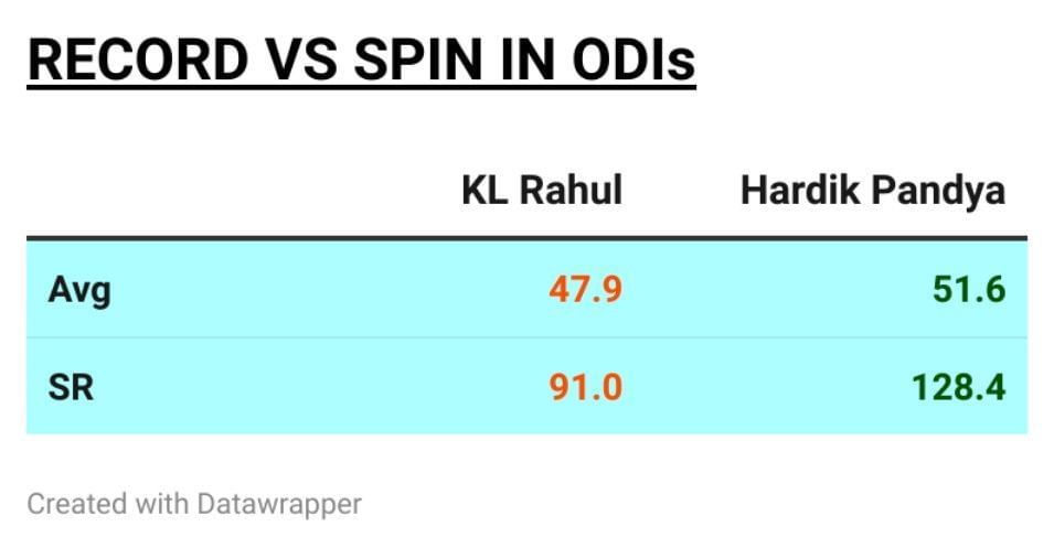 At No. 5, Hardik will get to face more spin. Here is a comparison of Rahul’s and Hardik’s numbers against spin in ODIs: