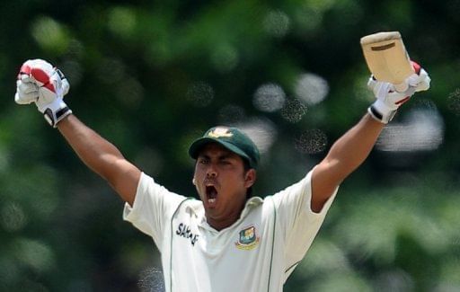 Bangladesh’s Mohammad Ashraful raises his bat in celebration after scoring a century against Sri Lanka in Galle on March 10, 2013. (Getty Images)
