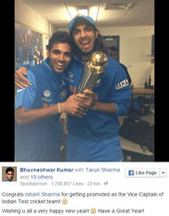 Yesterday however, Bhuvneshwar Kumar, another fast bowler in the team, released a picture featuring him with Ishant Sharma, the caption being “Congrats Ishant Sharma for getting promoted as the Vice Captain of Indian Test cricket team!.”