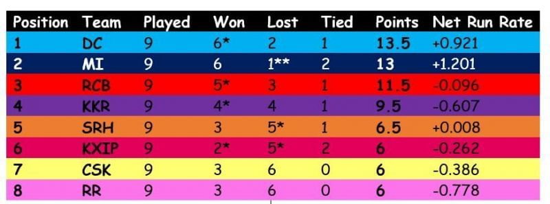 We can observe that Mumbai Indians and Royal Challengers Bangalore have equal points on the actual table, but would have been separated by three points had the points be shared. (Crucial for Top 2 finish)