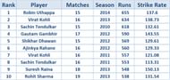 With an amazing average of 46.78, Uthappa is also the current Orange Cap holder and is only behind Chris Gayle and Michael Hussey who had both scored 733 runs in the 2012 and 2013 season respectively.