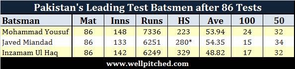 That record after 86 Tests shows that Yousuf was well ahead of the pack of all batting greats. Only Sangakkara and Lara scored more runs in that many Tests, and only Sachin scored more Test centuries.