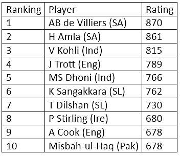 While there was no change in the top three batsmen, Jonathan Trott jumped up to fourth after a few solid performances in the Champions Trophy, pushing MS Dhoni down to fifth. Alastair Cook dropped two places after having an average tournament, while Shikhar Dhawan continued his steady progress, reaching 29th after appearing in just five one-dayers.