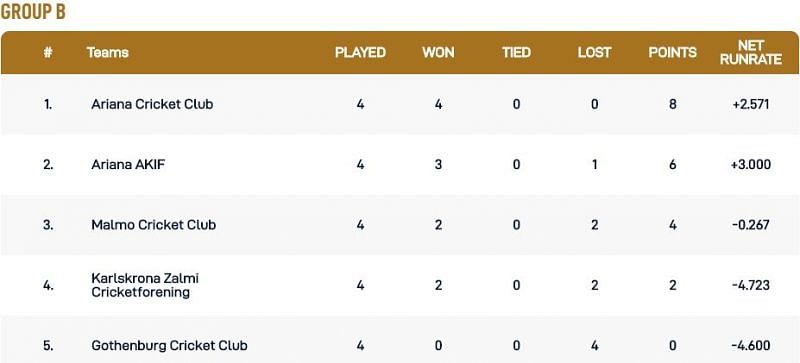 Ariana Cricket Club finished atop Group B with 8 points to their credit, after they won all their league stage encounters including their win against Ariana AKIF via the Golden Ball. They would be facing Karlskrona Cricket Club, the runners-up in Group A, in the second semi-final today.