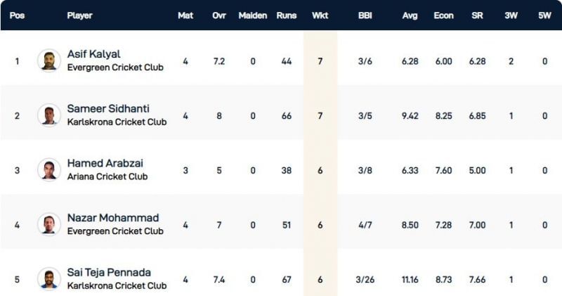Asif Kalyal of Evergreen Cricket Club and Sameer Sidhanti of Karlskrona Cricket Club have both taken 7 wickets in the four matches they have played to finish as the highest wicket-takers of the Malmo T10 League 2020 after the group stage action.