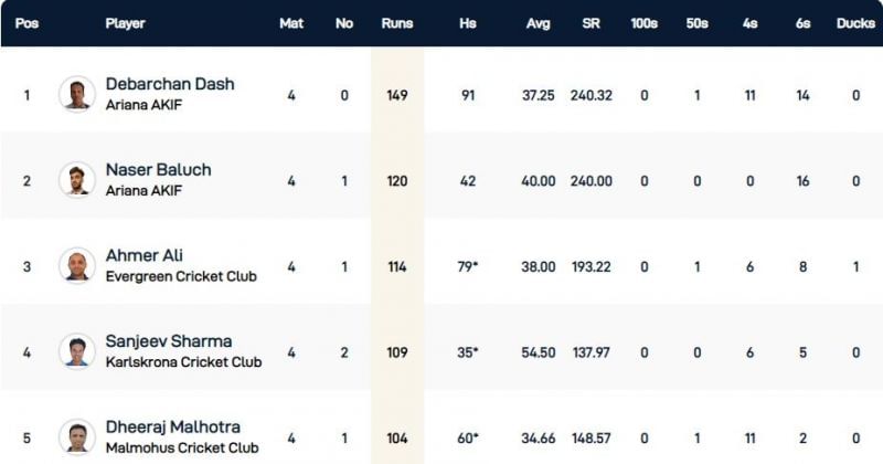 Debarchan Dash of Ariana AKIF has emerged as the highest run-getter of the Malmo T10 League 2020 after the conclusion of the group stage matches. He has smashed 149 runs in the four matches he has played with his 91-run knock being the highest individual score of the tournament so far. Dash's runs have come at an extraordinary strike rate of 240.32, and include 11 fours and 14 sixes.