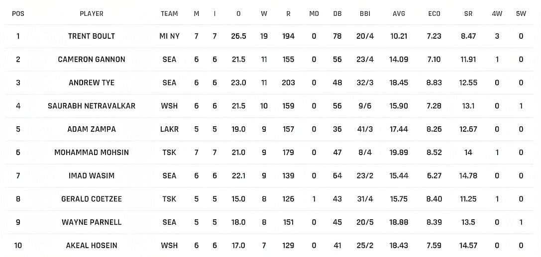 Saurabh Netravalkar is at the number four position in the wickets column. His 6/9 are the best bowling figures by any bowler in the short history of the MLC. In addition, he has claimed 10 wickets in this tournament at a remarkable average of 15.9. He will take no further part in the tournament as Washington has officially been eliminated from the tournament.