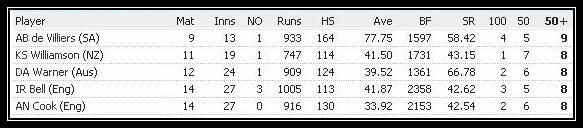 AB de Villiers finishes the year 2013 with 9 scores over 50 in tests. He has scored 933 runs from his 13 innings at an average of 77.75. His highest score in test in 2013 is 164.