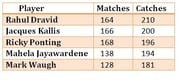 However, the world record for the most number of catches by a non-wicketkeeper in Test cricket is safe for the time being as Rahul Dravid is comfortably ahead of Kallis with 210 catches to his name. Sri Lankan batsman Mahela Jayawerdene, who is 37 years old and on 194 catches now, is the only player who has a realistic chance of breaking the record in near future.