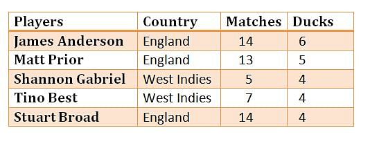 Here is a list of players who have scored the most number of ducks in Test matches in the year 2013. England has three players in the top five, more indicative of a disaster of an Ashes in Australia towards the end of the year.