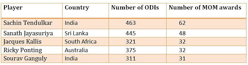 Sachin Tendulkar has won 62 MOM awards in ODIs