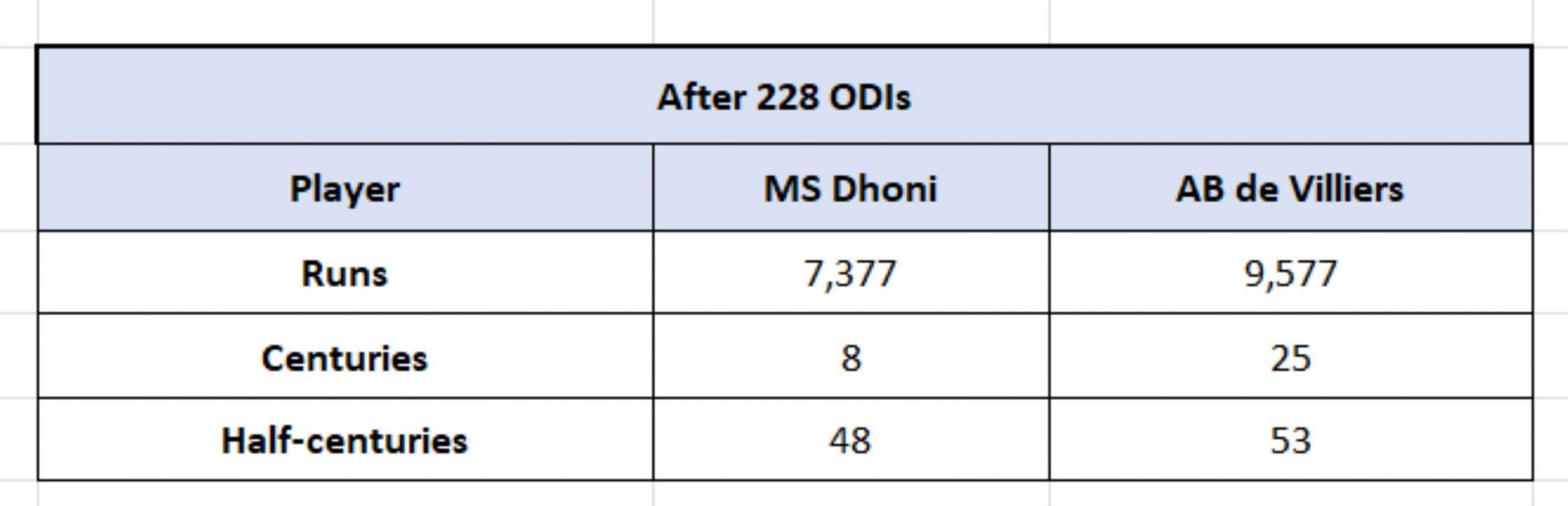 Considering De Villiers played only 228 ODI games in his career, it would be wise to see how Dhoni's numbers stacked up at the same stage (228 ODIs/2013) and compare them with De Villiers' across different categories.