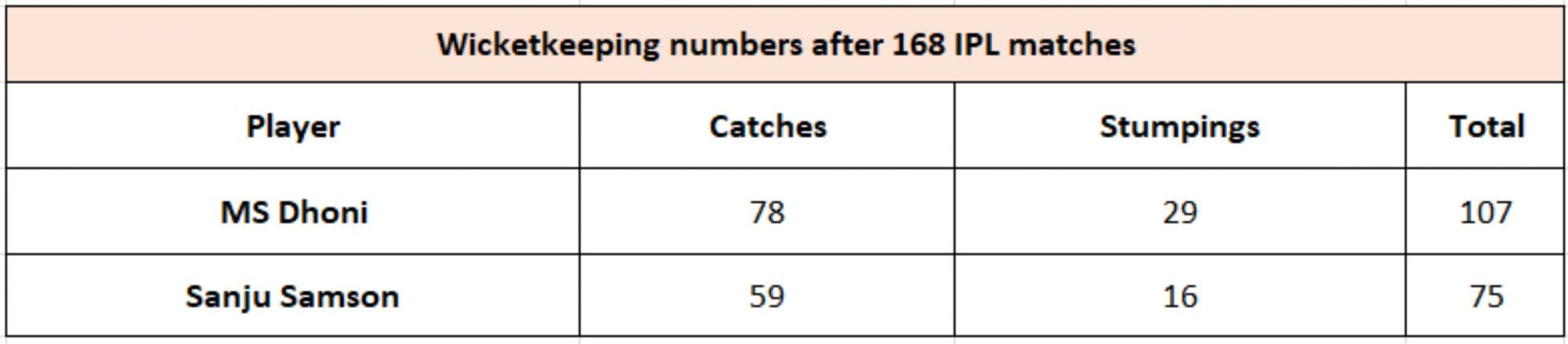 Finally, we come to the wicketkeeping numbers for Dhoni and Samson through 168 IPL matches. While the latter is widely regarded as solid behind the stumps, the former CSK skipper has several highlight reels on his ability to produce rapid stumpings off spinners.