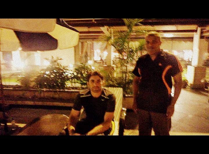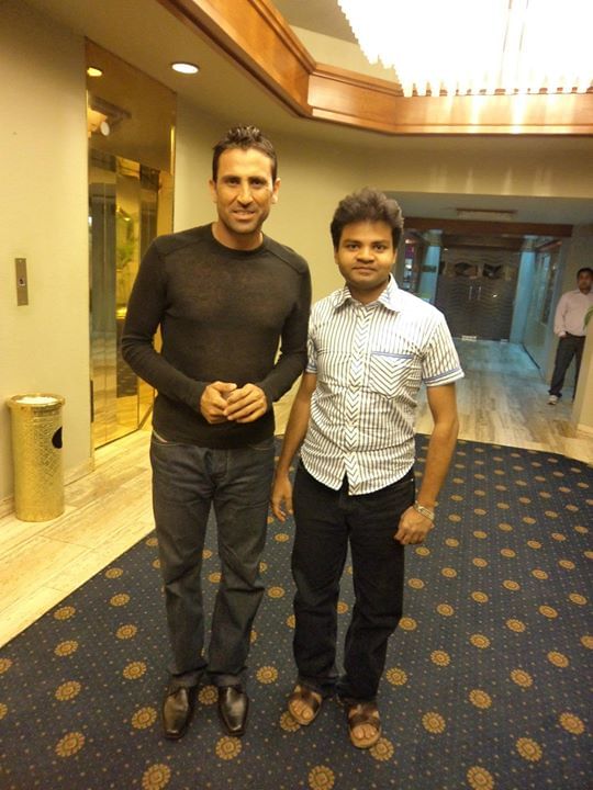 So, we moved to the pool side and discovered that Misbah-ul-Haq, Saeed Ajmal and Umar Gul were relaxing. I requested Misbah-ul-Haq for a snap with us and he agreed not in an encouraging manner. Arul and I had a snap with Misbah and then we proceeded towards Saeed Ajmal. But Ajmal was busy talking on mobile and we didn’t dare to disturb him.