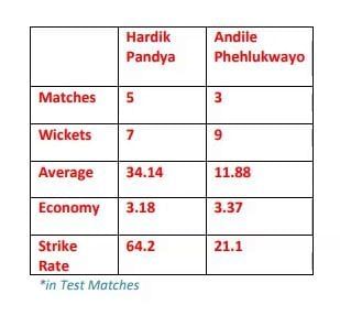 After taking three wickets in the first match at Cape Town, Pandya has not been able to break through with the ball in hand. Phehlukwayo, on the other hand, took two valuable wickets of Pujara and Pandya in the first innings itself.