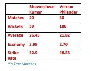 Bhuvi is a little less experienced than Philander when it comes to Test matches. However, as opposed to Philander who mostly uses the out swinger, Bhuvi mixes his out swingers and in swingers a lot better. His wrist position is also such that it is very hard to pick up as compared to Vernon.