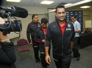 India’s cricket captain Mahendra Singh Dhoni (front R) smiles after a press conference following the team’s arrival at Auckland International Airport for the cricket series against New Zealand on January 13, 2014. New Zealand and India will play five one-day internationals between January 19 and 31, followed by two Tests in Auckland and Wellington in February.