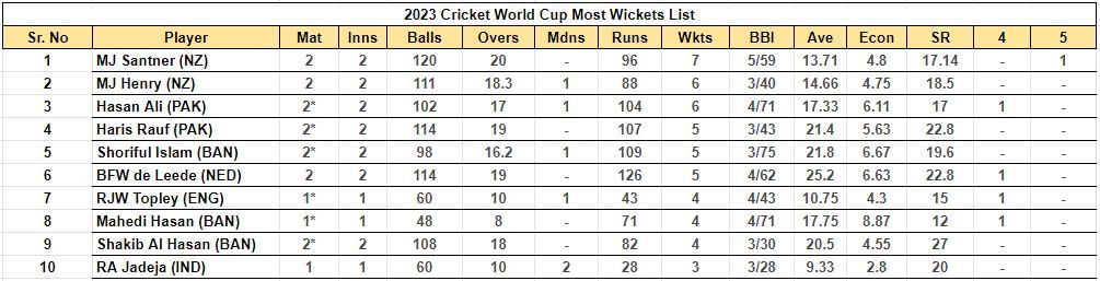 2023 World Cup Most Wickets List