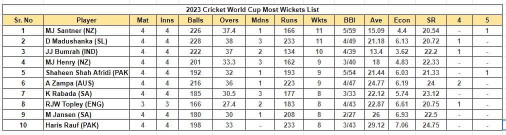 Mitchell Santner remains atop the bowling chart. He has taken 11 wickets in four games at an average of 15.09, an economy of 4.40, and a strike rate of 20.54.