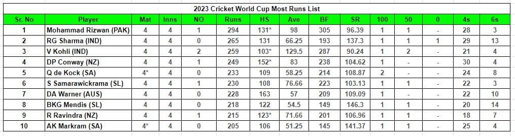 Mohammad Rizwan stands as the tournament's top run-scorer. He has amassed 294 runs in four innings at an impressive average of 98 and a strike rate of 96.39.