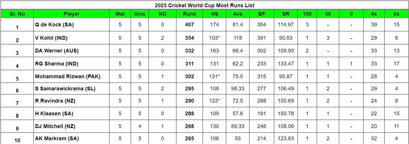 South African opener Quinton de Kock remains at the top in the batting standings with 407 runs from five innings at an average of 81.4 and a strike rate of 114.97. Former Indian skipper Virat Kohli retained his second rank with 354 runs at an astounding average of 118 and a strike rate of 90.54.