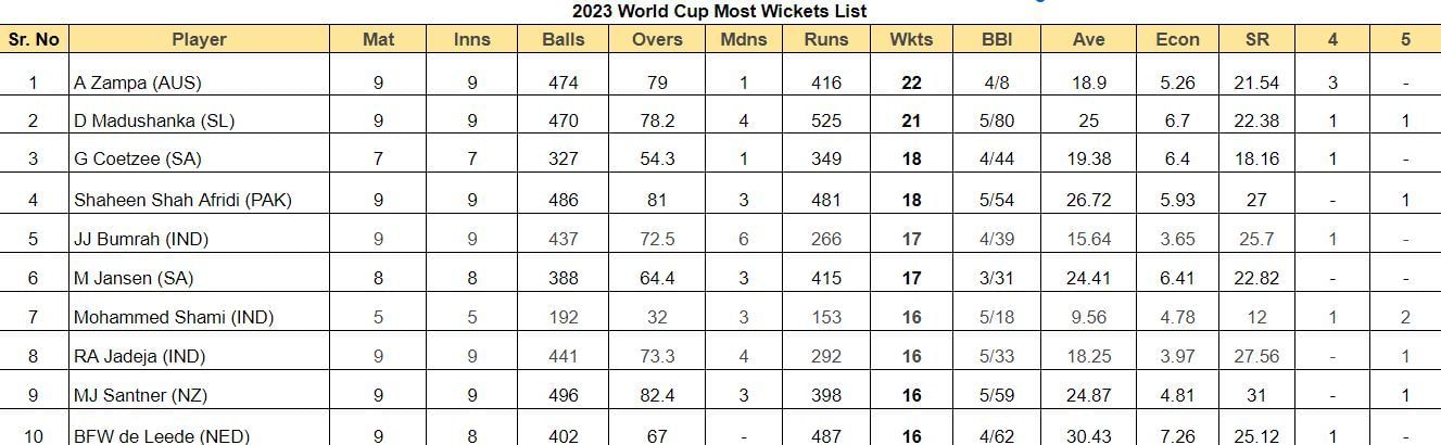 Sri Lankan pacer Dilshan Madushanka stays at the second spot with 21 wickets. South African pacer Gerald Coetzee occupies the third spot with 18 wickets from seven innings at an average of 19.38.